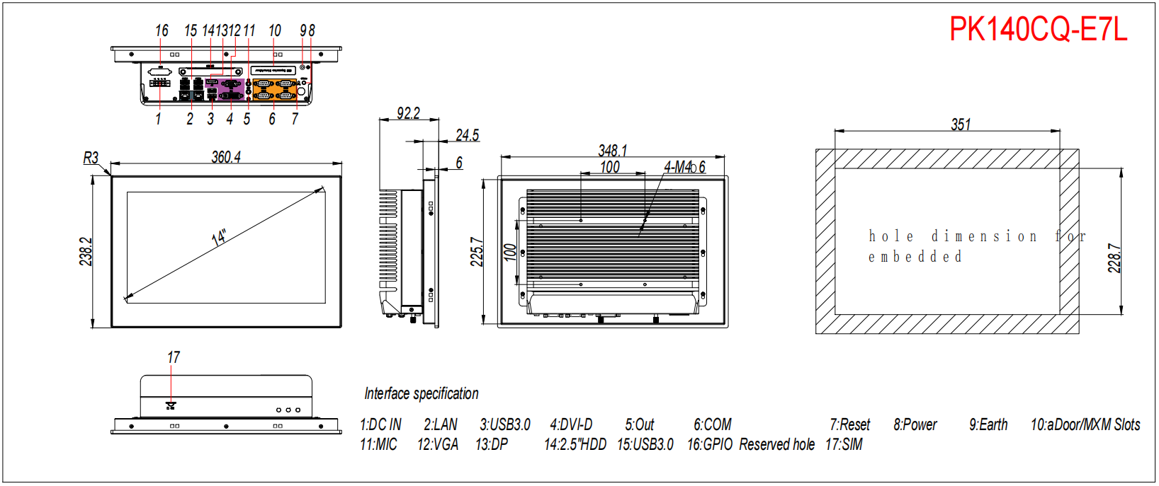 | 串口 | 4 * DB9 RS232(COM1/COM2支持RS485/RS422/RS232,BIOS控制) | |