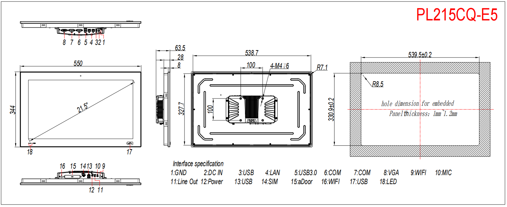 | LCD参数 | 显示类型 | 21.5”(XGA)a-Si TFT-LCD |